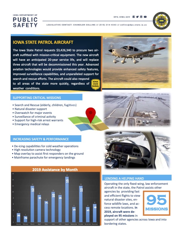 The COVID-19 pandemic interrupted the 2020 legislative session. When lawmakers returned in June, they approved most of the Department of Public Safety’s requests in the Rebuild Iowa Infrastructure Fund appropriations bill. That bill included $1,713,170 for “the purchase of an airplane”—half what the agency had sought.