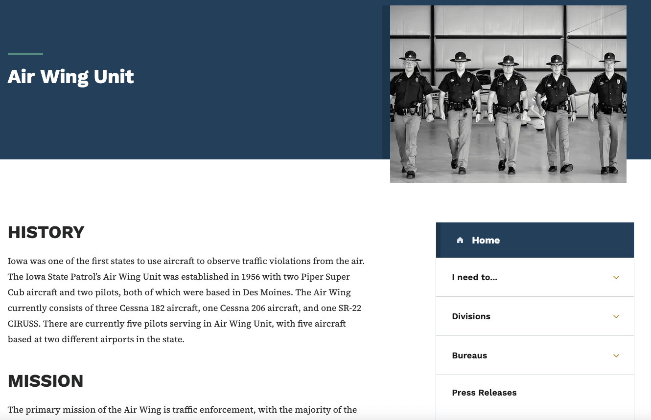 Even now, the website for the Iowa State Patrol’s Air Wing Unit does not mention the Cessna 208B Grand Caravan. It incorrectly states, “The Air Wing currently consists of three Cessna 182 aircraft, one Cessna 206 aircraft, and one SR-22 CIRUSS [sic]. There are currently five pilots serving in Air Wing Unit, with five aircraft based at two different airports in the state.”