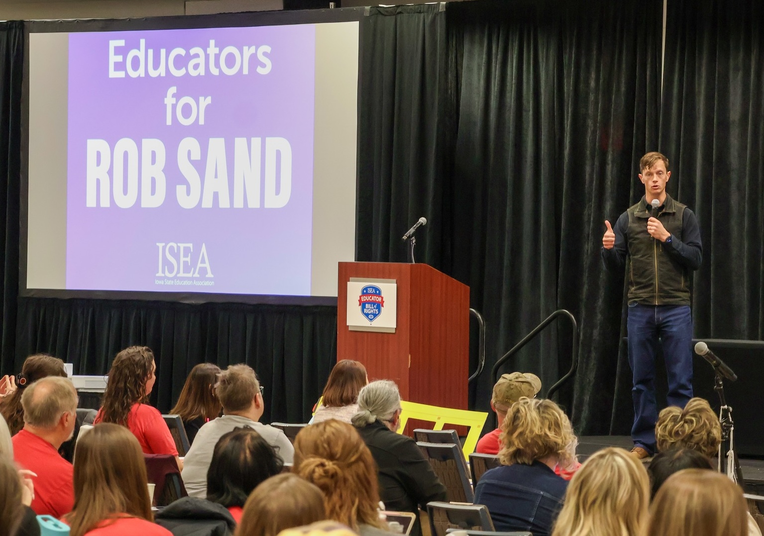 “You might be our secret weapon,” State Auditor Rob Sand told hundreds of people attending the Iowa State Education Association’s annual meeting in West Des Moines on April 11. He was speaking because the ISEA PAC decided to recommend the presumptive Democratic nominee for the 2026 governor’s race.